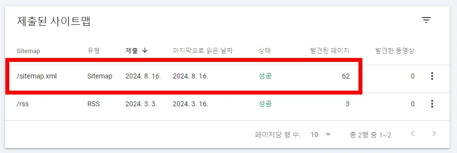 7. 새로 제출된 사이트맵 상태가 '성공'으로 보이면 완료입니다. 혹시 마지막으로 읽은 날짜가 업데이트 안 돼있는 경우 새로고침을 한번 해주면 오늘로 업데이트가 됩니다!