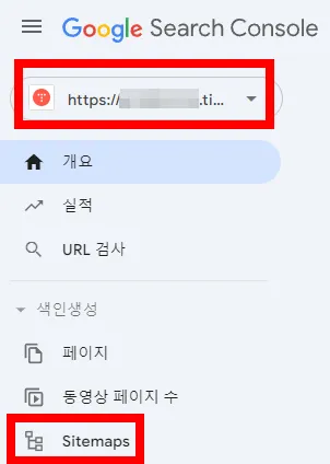 1. 구글 서치 콘솔에 접속해서 왼쪽 상단 주소창에 내 블로그주소를 선택하고 밑에 "sitemaps"을 클릭합니다.