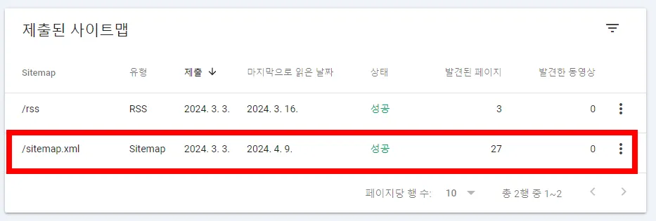 7. 새로 제출된 사이트맵 상태가 '성공'으로 보이면 완료입니다. 혹시 마지막으로 읽은 날짜가 업데이트 안 돼있는 경우 새로고침을 한번 해주면 오늘로 업데이트가 됩니다!