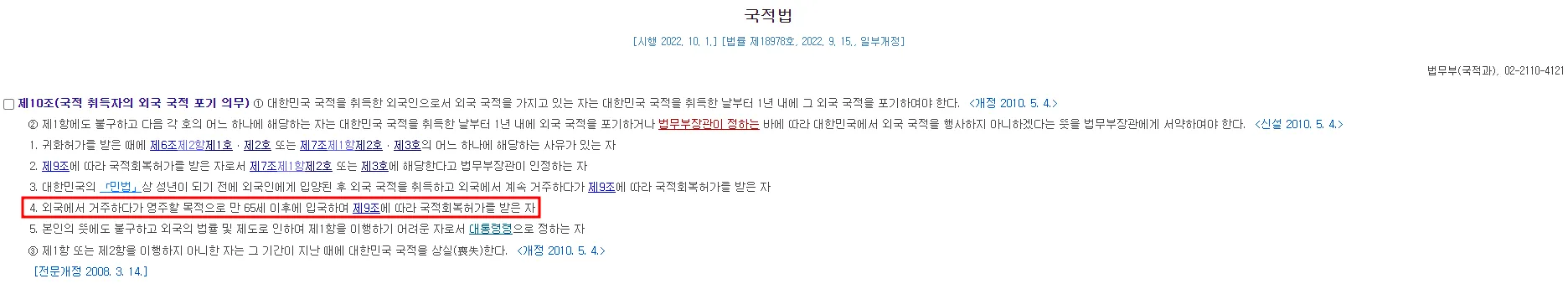 ✅ 국적회복 신청자(국적법 제10조 제2항 제4호 외국에서 거주하다가 영주 할 목적으로 65세 이후에 입국하여 국적회복허가를 받은 자)의 경우 외국국적불행사서약(복수국적 인정)을 하려는 사람은 국적회복 허가 심사결정 시점에 국내 입국이 필요