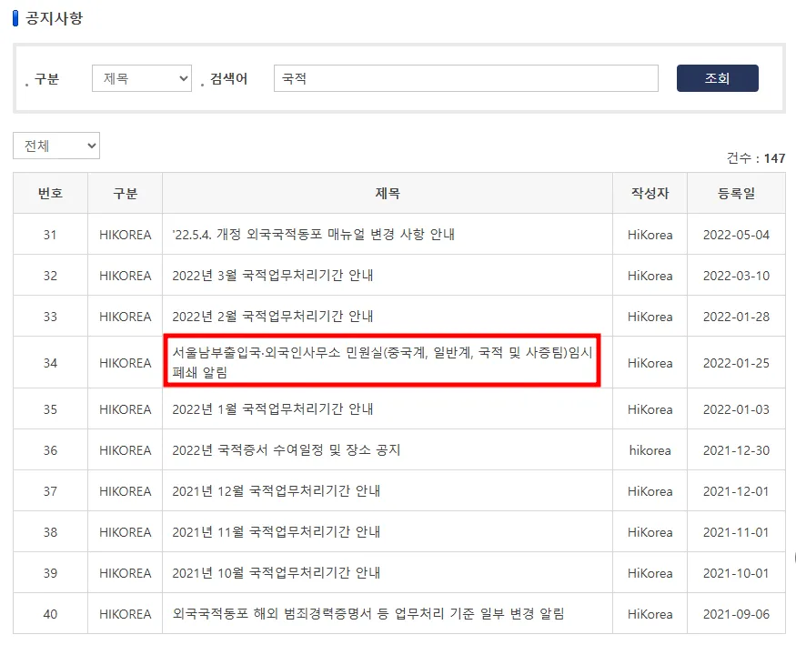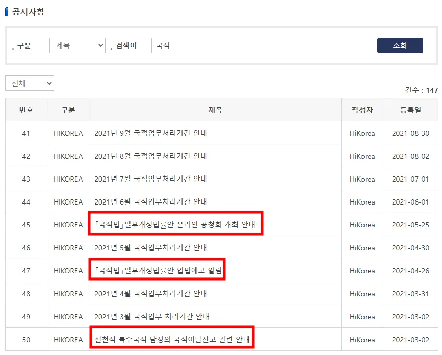 하이코리아 공지사항에서 검색어에 국적을 입력하고 조회를 하면 관련 게시글 확인이 가능합니다. 아래 보시는 것과 같이 매달 국적업무 처리기간 안내가 업데이트되고 있으므로 참고하실 수 있습니다. 또한 국적증서 수여 일정 및 장소 알림, 출입국 사무소 임시 폐쇄 알림, 국적법 입법 예고 알림, 선천적 복수국적 남성의 국적이탈신고 관련 안내 등 다양한 국적 및 사무소 관련 업데이트 사항들도 확인할 수 있습니다.