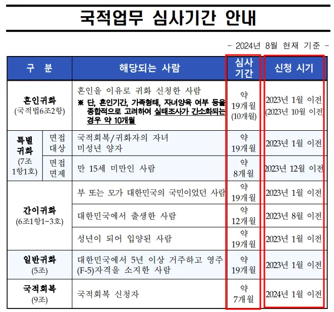 ✅ 귀화신청자의 경우 장기 출국, 보완 요청 서류 미제출 등 사유가 있는 경우 심사기간이 추가로 소요될 수 있음