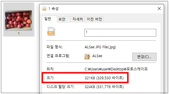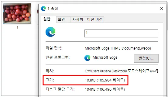 변환된 사진에 우클릭을 해서 속성을 보면 파일형식이 webp로 변환되고 크기도 103KB로 줄어든 것을 확인할 수 있습니다.