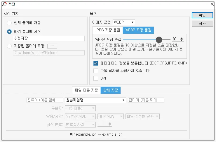 아래 사진과 같이 설정 후 '확인'을 클릭합니다. 이미지 포맷은 WEBP로 설정하고 WEBP 저장 품질의 경우 품질값이 낮을수록 파일 크기가 줄어들지만 이미지 품질 또한 나빠진다고 하니 참고하셔서 설정하시면 됩니다.