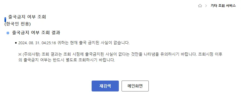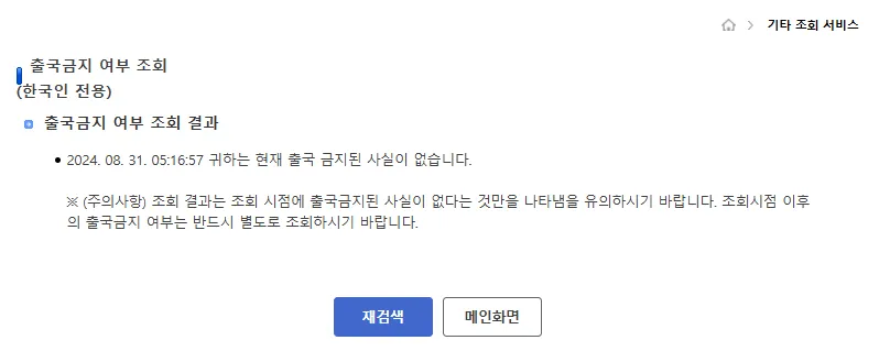 아래와 같이 출금금지 여부 조회 결과 확인이 가능합니다. 조회 결과는 조회 시점에 출국 금지된 사실이 없다는 것만을 나타냄을 유의하시기 바랍니다.