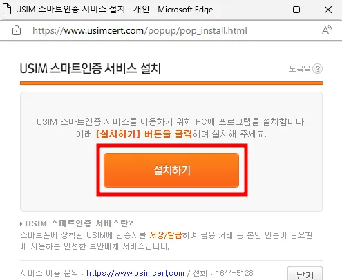 위와 같이 한번 더  인증서 팝업창에서 스마트 인증 클릭 >  스마트 공인인증 서비스 프로그램 설치 메시지가 뜨면 확인을 클릭 순으로 진행합니다. 그럼 USIM 스마트인증 서비스 설치하기 팝업창이 뜨며 설치하기를 클릭> 열기 클릭 순으로 진행합니다. 설치가 완료되면 확인을 클릭합니다.