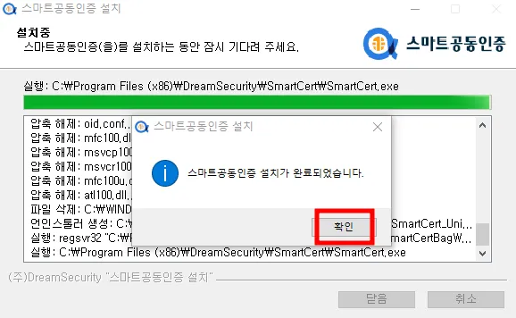 인증 팝업창이 뜨면 스마트 인증을 클릭합니다. 스마트 공인인증 서비스 프로그램 설치 메시지가 뜨면 확인을 클릭합니다.