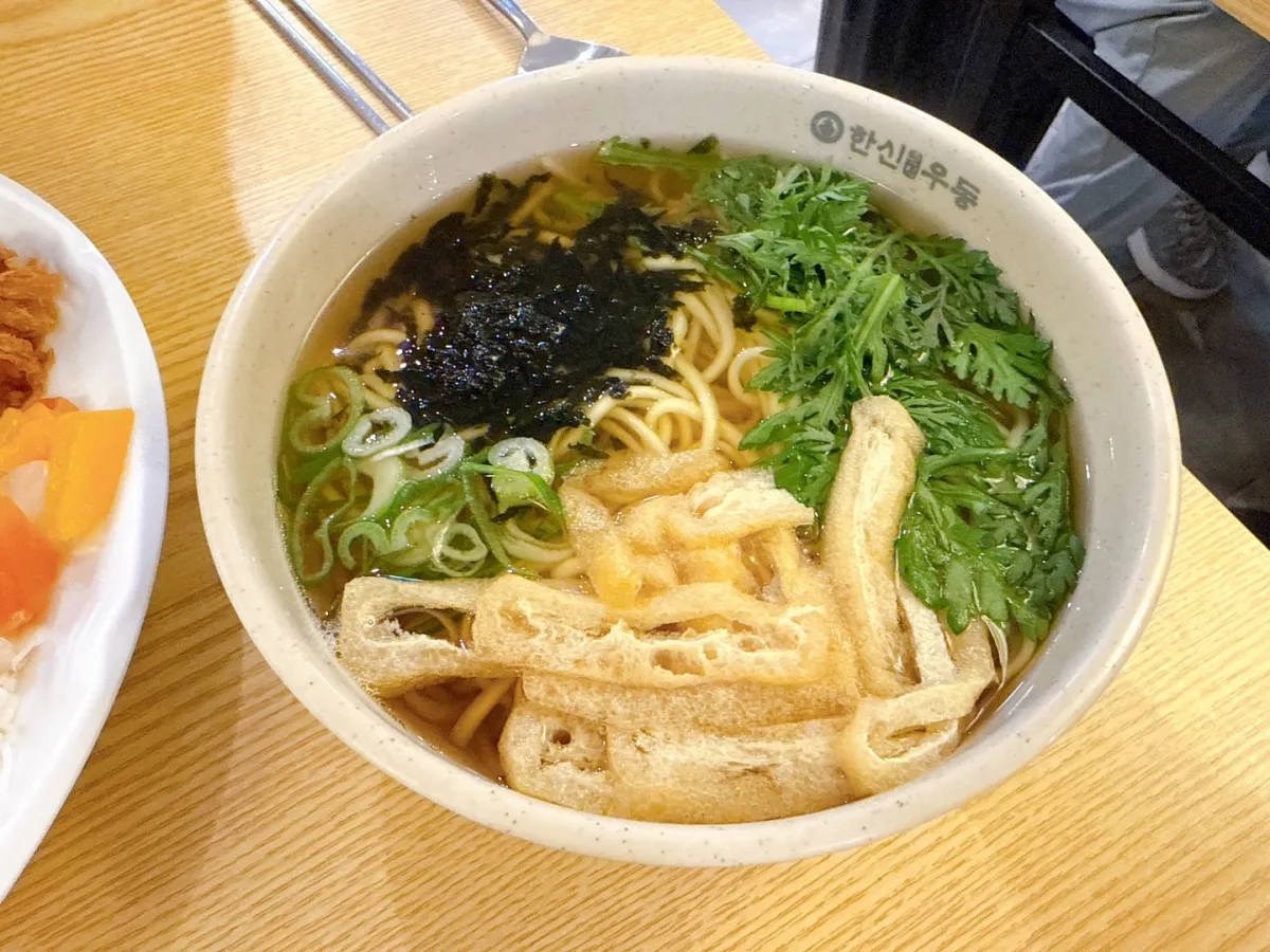 즉석우동은 한신우동의 대표 메뉴예요. 쑥갓, 김가루, 파, 유부도 듬뿍 얹어주시는데 정말 맛있답니다. 어묵을 좋아하시는 분들은 어묵 가락국수도 추천드려요!