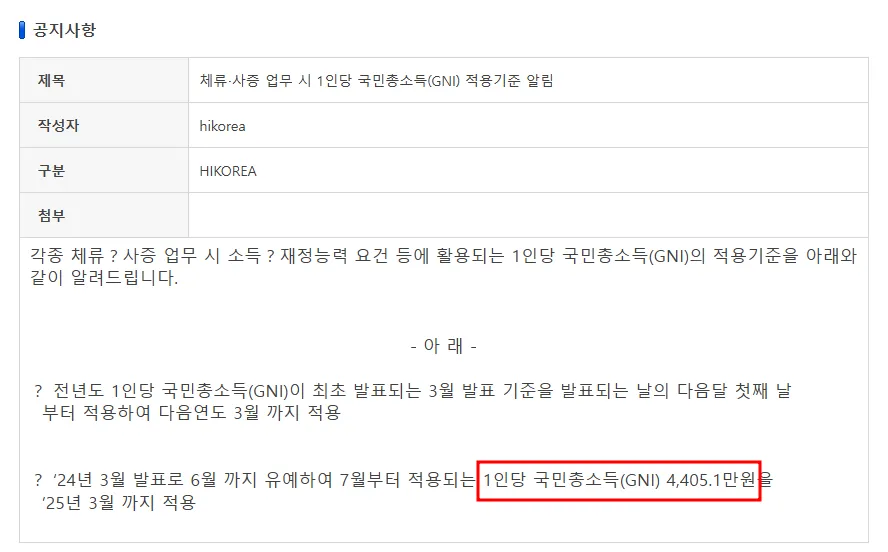 2024-06-26일 자로 등록된 '체류사증 업무 시 1인당 국민총소득(GNI) 적용기준 알림' 내용을 확인하시어 업무를 보시면 됩니다.