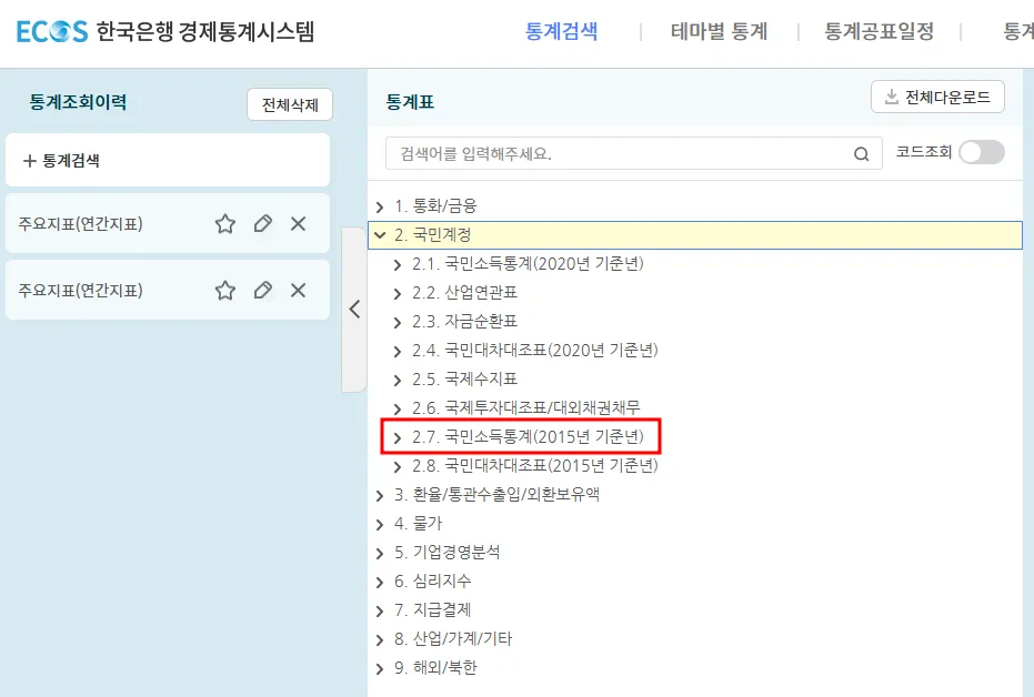 '국민계정' 중 '국민소득통계(2015년 기준년)'을 클릭합니다.