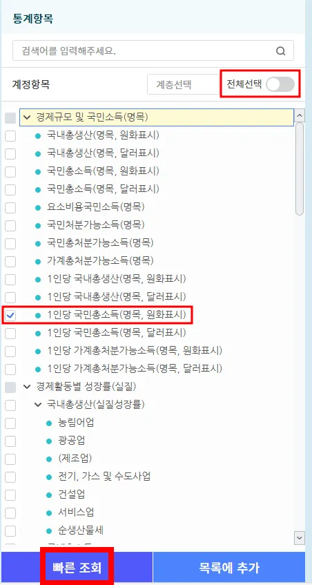 '경제규모 및 국민소득(명목)' 중 '1인당 국민총소득(명목, 원화표시)'를 선택하고 하단에 빠른 조회를 클릭합니다. 우측 상단에 '전체선택'을 활성화시키면 그 외의 내용들도 확인이 가능합니다.