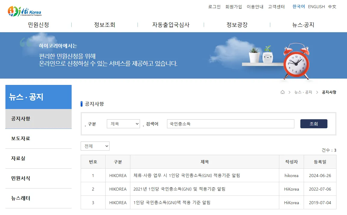 출입국사무소에서 비자 관련 업무를 볼 때 소득 / 재정능력 요건 등에 1인당 국민총소득(GNI)이 기준이 되는 경우가 있는데요. 오늘은 1인당 국민총소득(GNI)이 무엇인지, 연도별 1인당 국민총소득(GNI)을 어떻게 확인할 수 있는지, 체류·사증 업무시 적용기준을 정리해 보도록 하겠습니다.