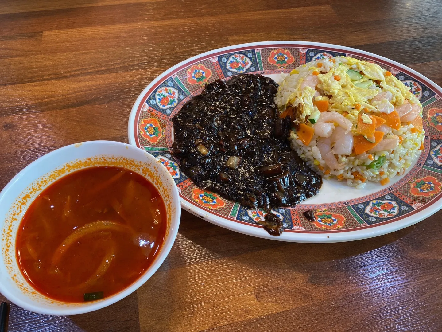 새우볶음밥입니다. 짬뽕국물이 같이 나오는데요. 보시는 거 같이 탱글탱글한 새우도 많이 들어가고 계란이랑 야채가 듬뿍 들어가 있어요.