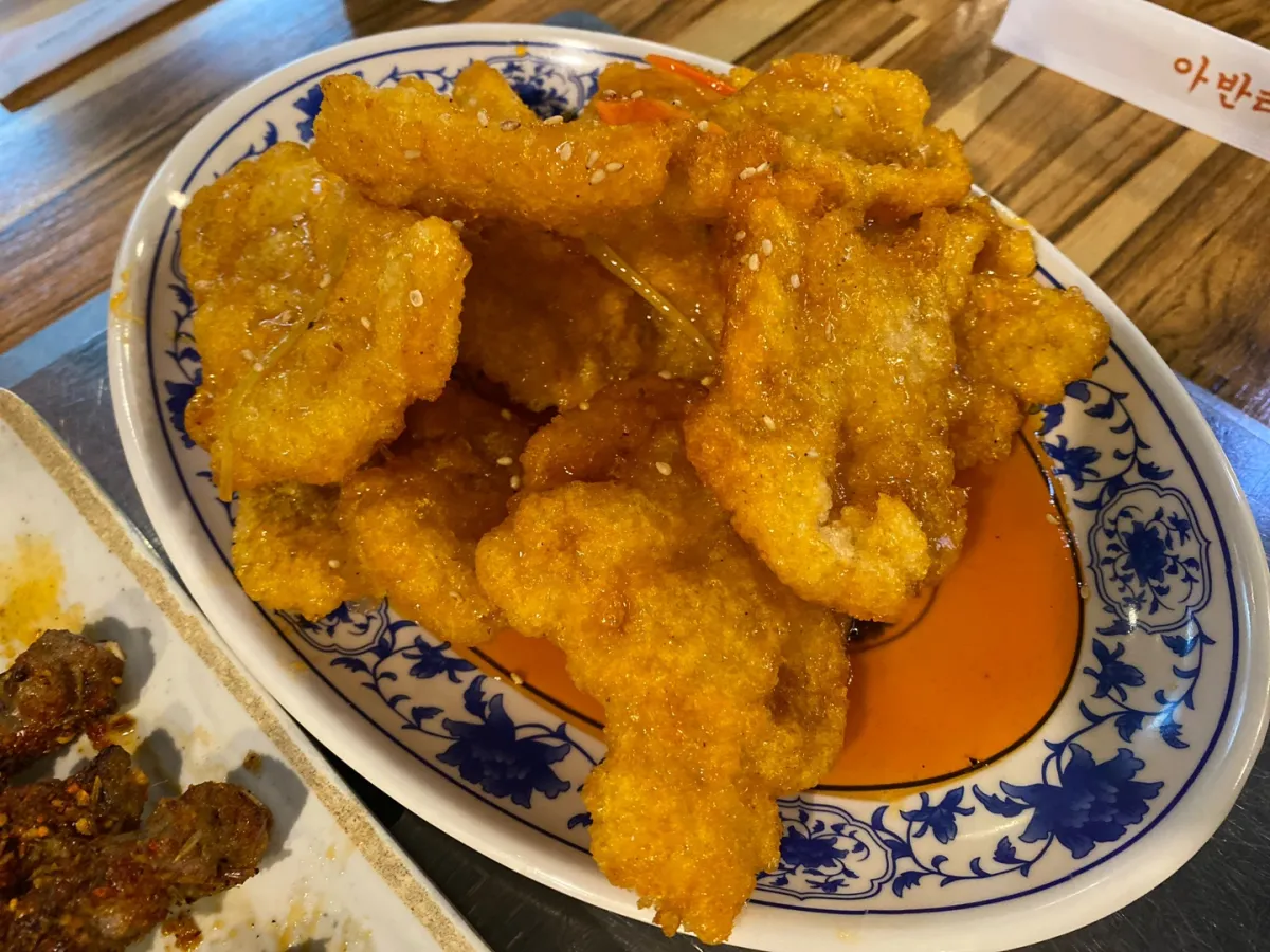기본 꿔바로우와 사천 꿔바로우가 있었는데 저희는 기본으로 주문하였습니다. 다른 데서 먹어본 거랑 다르게 이곳은 고추기름을 사용한 거 같았어요. 근데 쫀득쫀득하고 달달하면서 고소하고 정말 맛있었답니다.