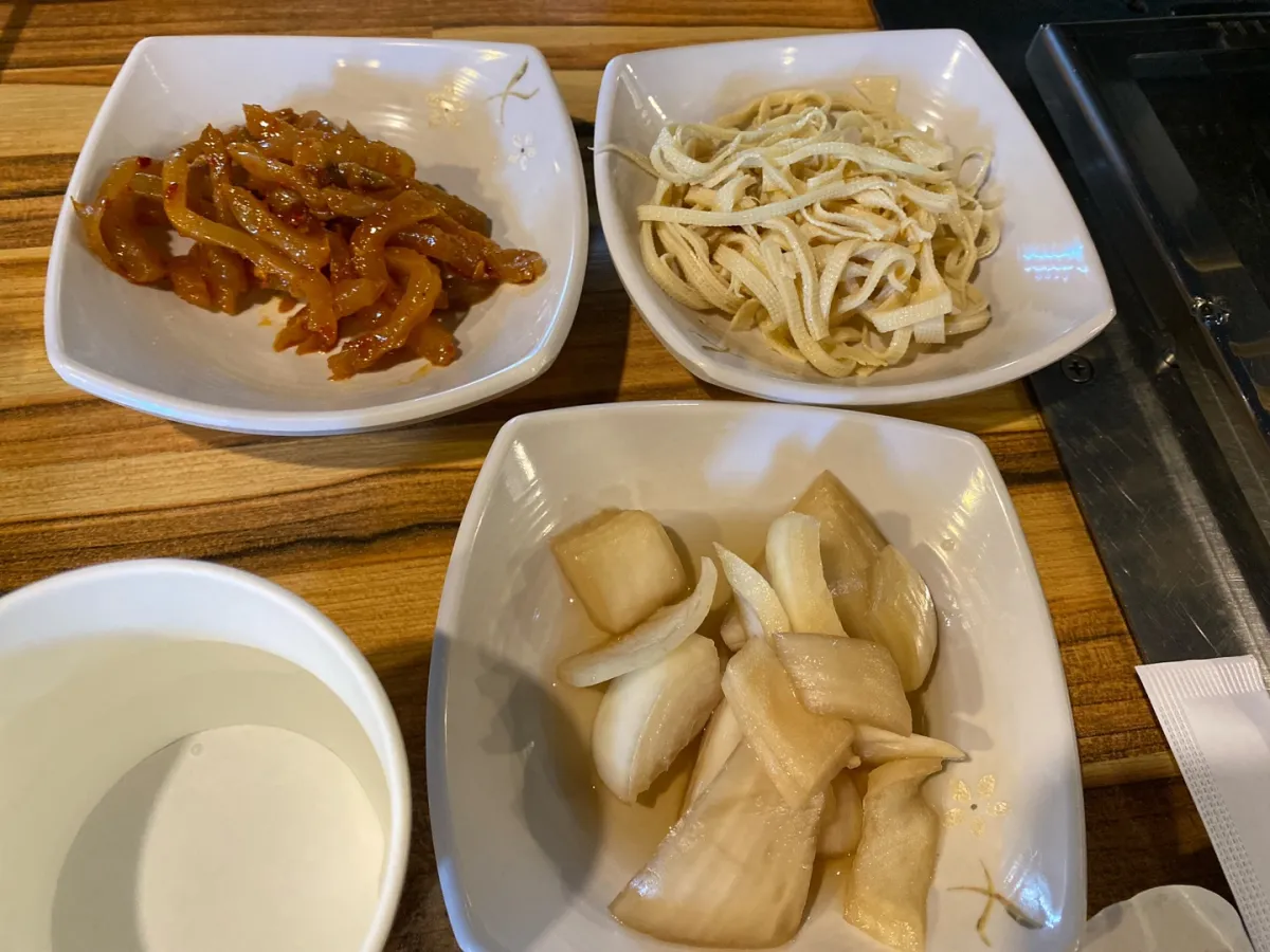밑반찬으로 두부면, 양파장조림, 그리고 이름은 모르겠는데 오이장아찌 같은 걸 주셨어요. 그리고 쯔란은 개인별로 주십니다.