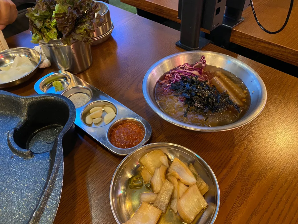 기본 상차림입니다. 저 묵사발 진짜 시원하고 맛나더라고요. 야채도 듬뿍 들어있습니다. 고추냉이도 나오는데 삼겹살 위에 살짝 얹어먹으니 정말 맛나더라고요!