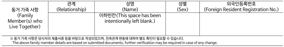 출입국사무소에 외국인등록 또는 거소신고를 한 외국인이라면 '외국인등록 사실증명' 또는 '거소신고 사실증명'을 발급받을 수 있는데요. 해당 서류에 동거가족사항(Family Member who live together)의 성명, 성별, 국내거소신고번호(외국인등록번호), 관계가 기재되는 부분이 있습니다. 동거 가족 사항은 당사자의 제출 서류 등을 바탕으로 작성이 되므로 신고 이후의 친족관계 변동에 대해 별도 확인이 필요할 수 있는 점 참고해 주세요.