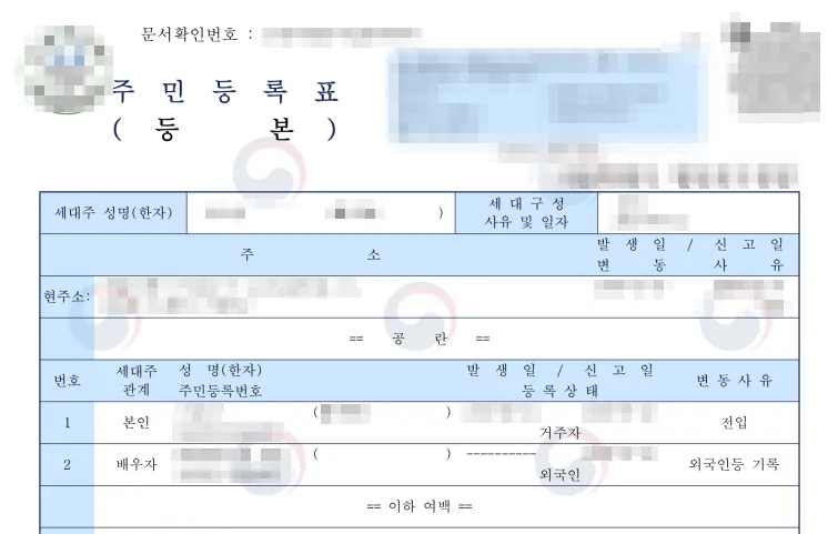 혼인 신고 후 F-6 비자를 받고 외국인 등록증까지 발급받았다면 한국인의 가족관계증명서나 혼인관계증명서를 발급받았을 때 외국인 배우자의 정보를 바로 확인할 수가 있는데요! 단, 한국인의 주민등록등본을 발급받았을 때는 외국인 배우자 정보가 나오지 않아 어떤 경우인지 궁금해하시는 경우가 많이 있습니다.