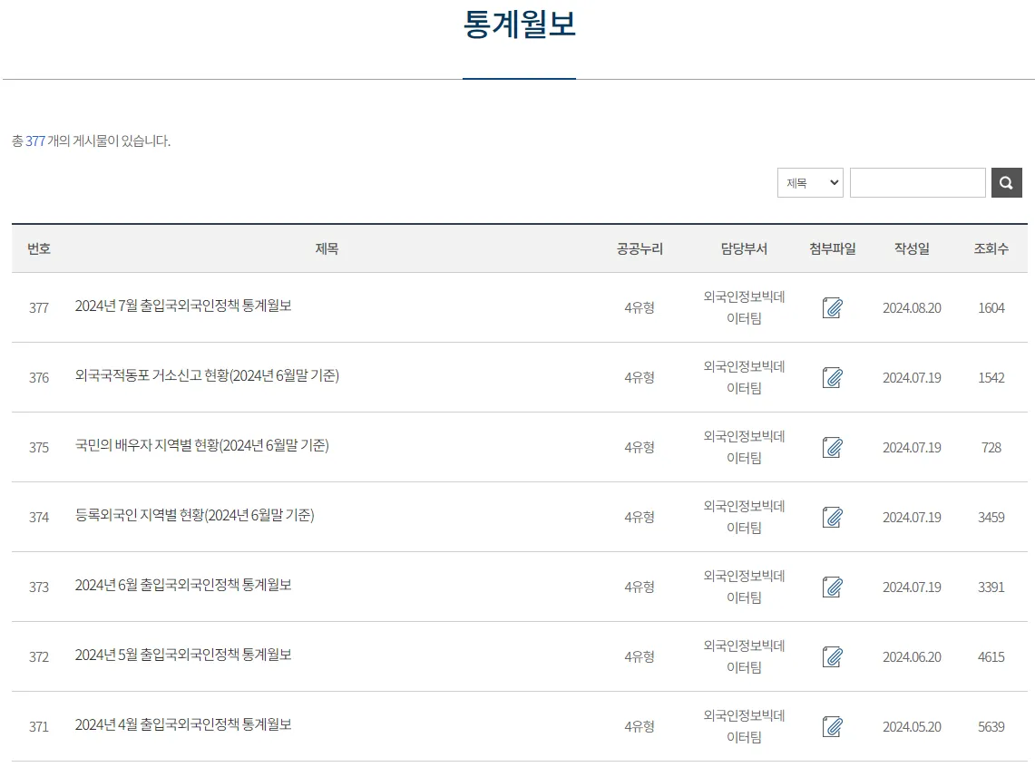 통계월보를 보시면 매달 출입국외국인정책 통계월보, 등록외국인 지역별 현황, 국민의 배우자 지역별 현황, 외국국적동포 거소신고 현황이 업데이트되고 있습니다. 현재 기준으로 2024년 7월 출입국외국인 정책 통계월보까지 게재가 되어있네요.