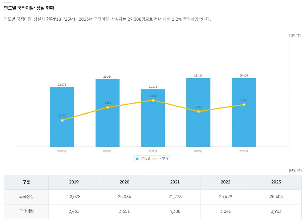 연도별 국적취득자(귀화+국적회복) 현황, 연도별 혼인귀화자 현황, 연도별 국적이탈·국적상실 현황 및 증감 추이를 확인할 수 있습니다.