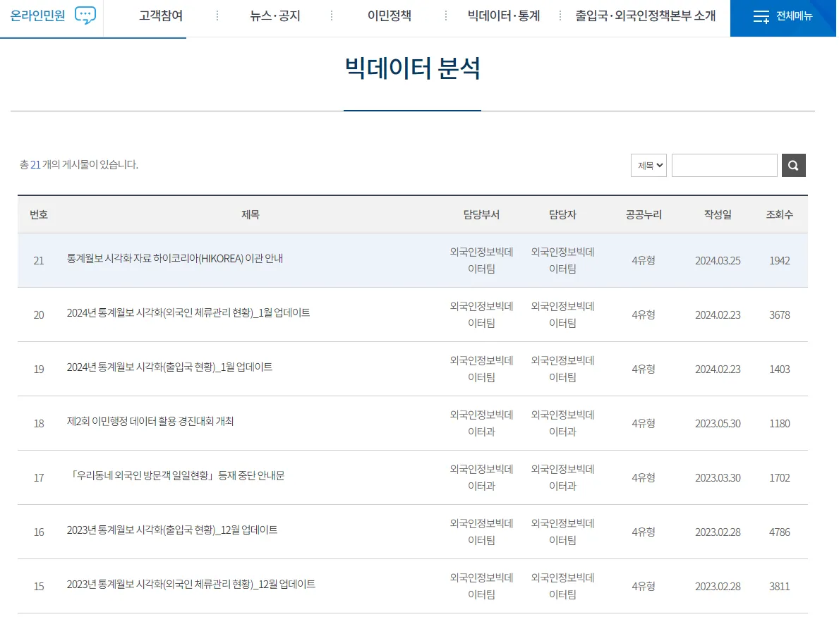 출입국·외국인정책본부 사이트에 아래와 같이 출입국 현황과 외국인 체류관리 현황이 1월까지 업데이트된 것을 확인할 수 있습니다. 다만 통계월보 시각화 자료가 24.3.11부로 하이코리아 사이트 '정보광장'내'빅데이터 분석·시각화' 메뉴에 제공됨에 따라 본부 홈페이지에 자료 업데이트가 종료되게 되었습니다.