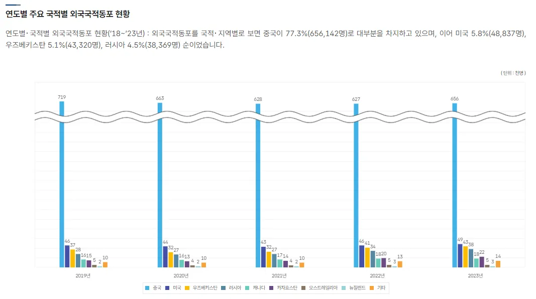 연도별 외국국적동포 현황, 연도별 주요 국적별 외국국적동포 현황, 연도별 외국국적동포 거소신고 현황 및 증감 추이를 확인할 수 있습니다.