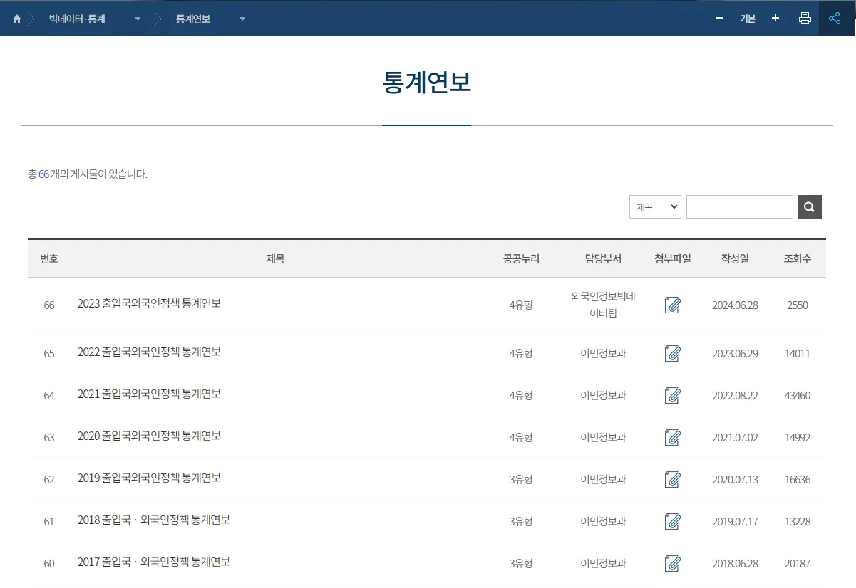 통계연보에서는 연도별 출입국외국인 정책 통계연보 확인이 가능합니다.