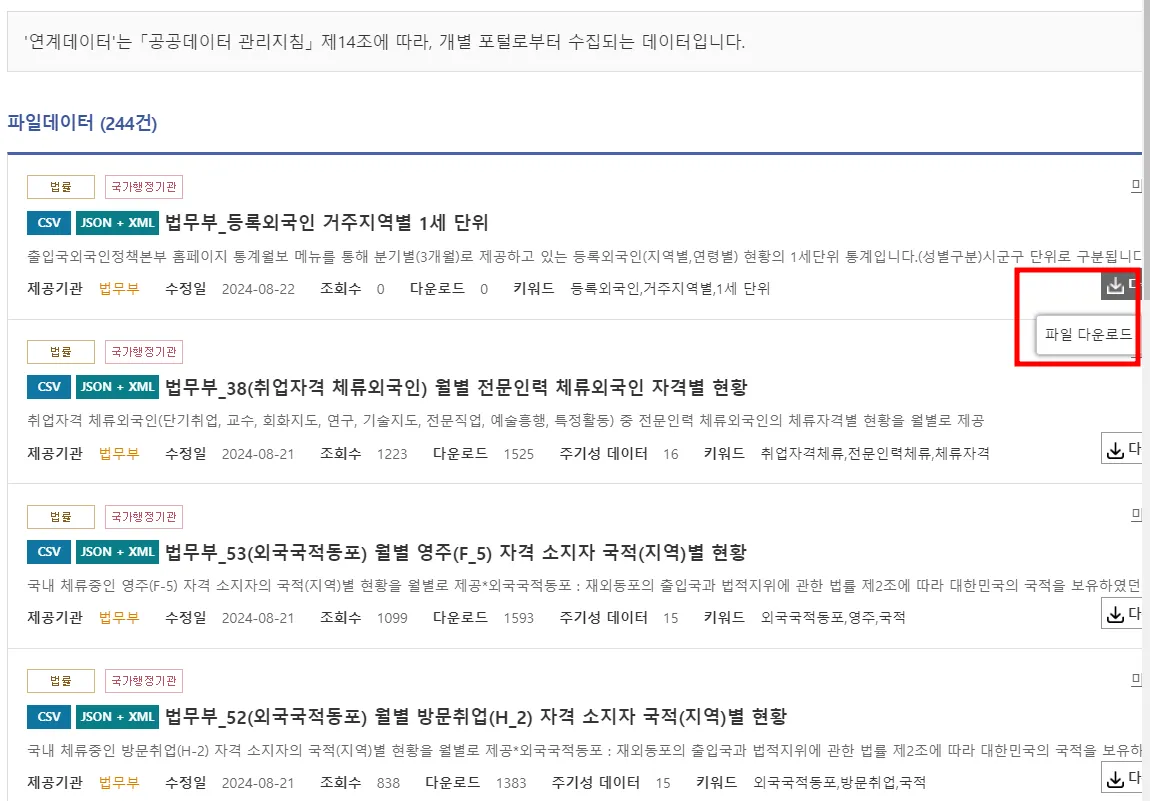 법무부가 제공하는 월별 영주자격 소지자 국적(지역) 별 현황 등의 파일 데이터를 다운로드할 수 있으며 제공 목록에 포함되지 않은 공공데이터를 신청하실 수 있습니다.