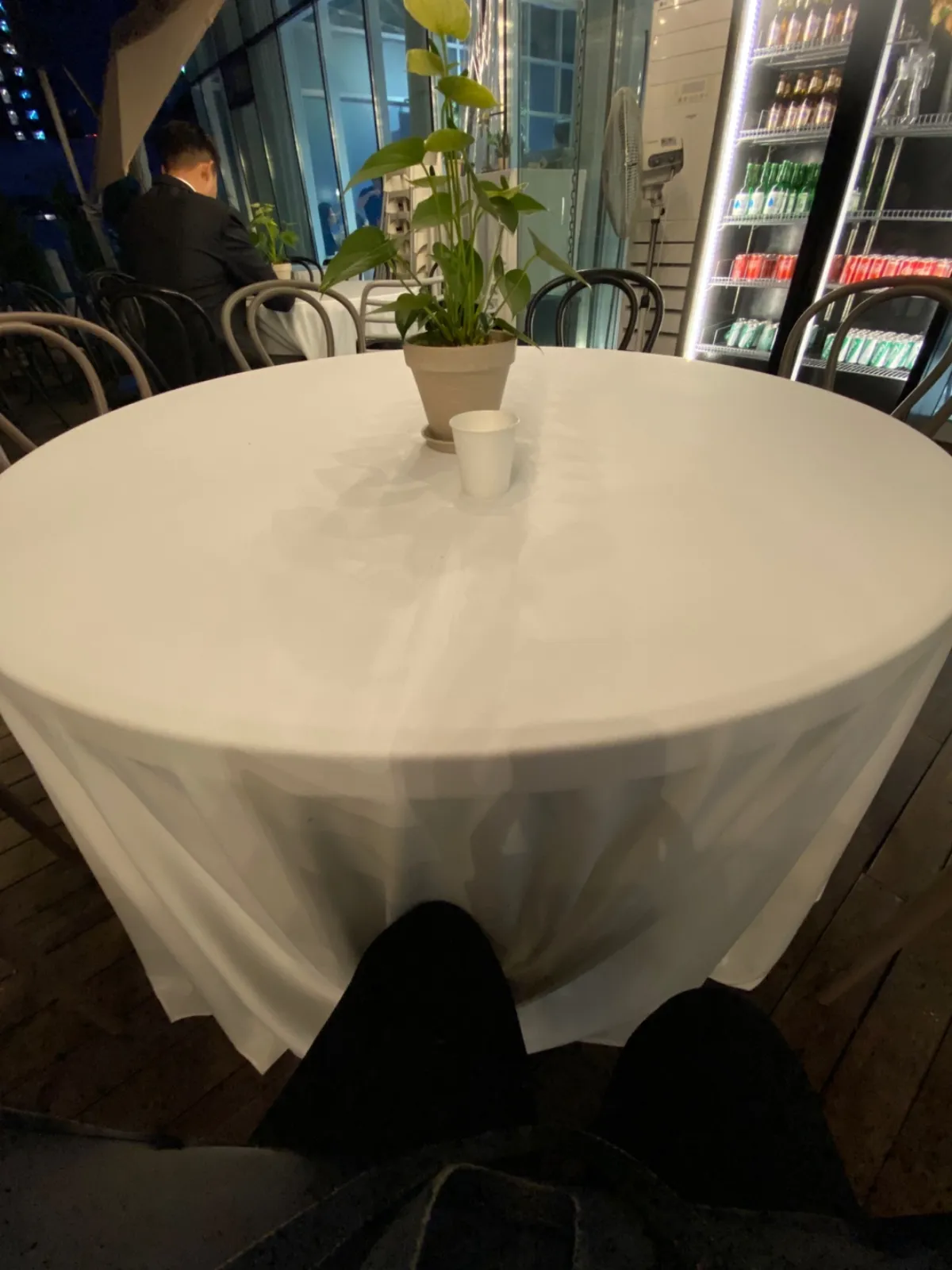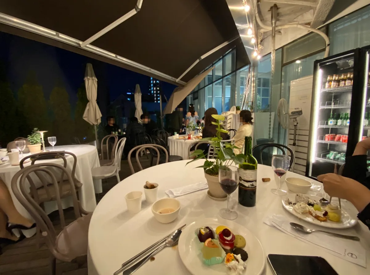 식장 왼쪽문으로 나가면 야외 테라스에도 식사를 할 수 있는 테이블이 마련되어 있는데요. 자리도 너무 가깝지 않고 분위기도 너무 좋더라고요.