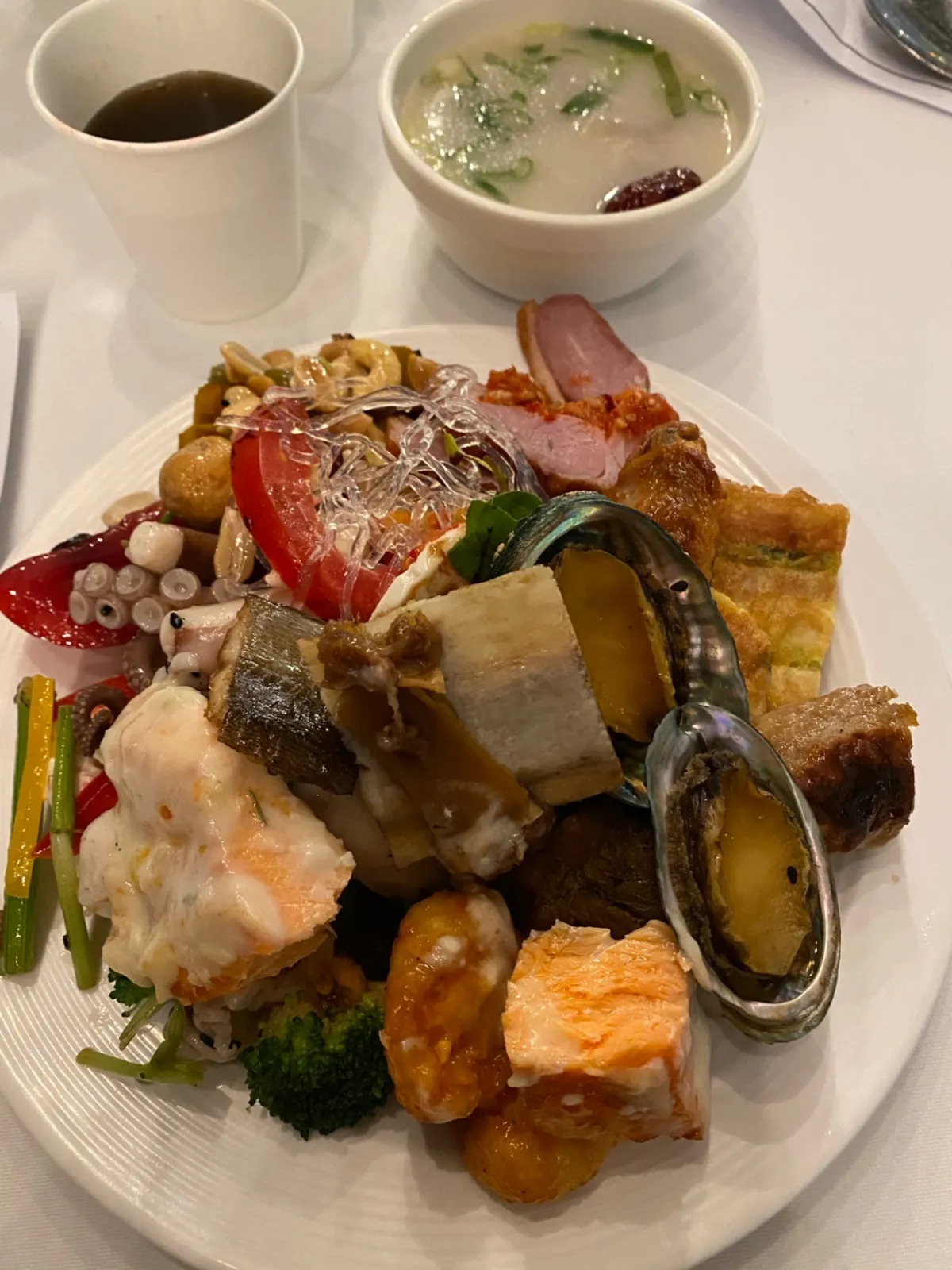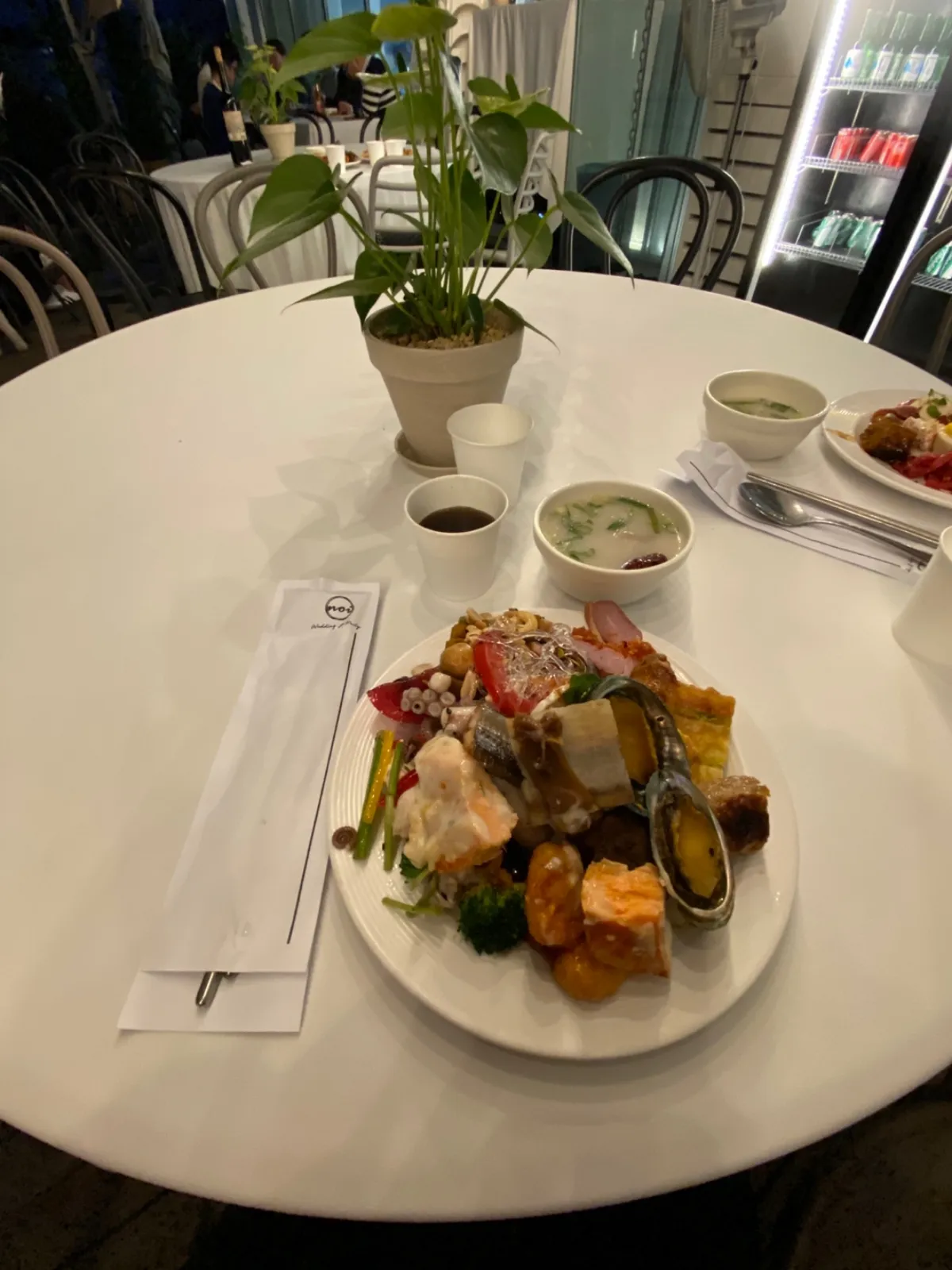 예식이 끝나면 식사는 식장 뒤쪽에 뷔페로 차려지는데요. 음식이 정말 고급스럽고 정갈하더라고요. 고기, 해산물, 야채, 견과류 샐러드, 전복, 전, 곰국 등 메뉴가 정말 좋았어요.