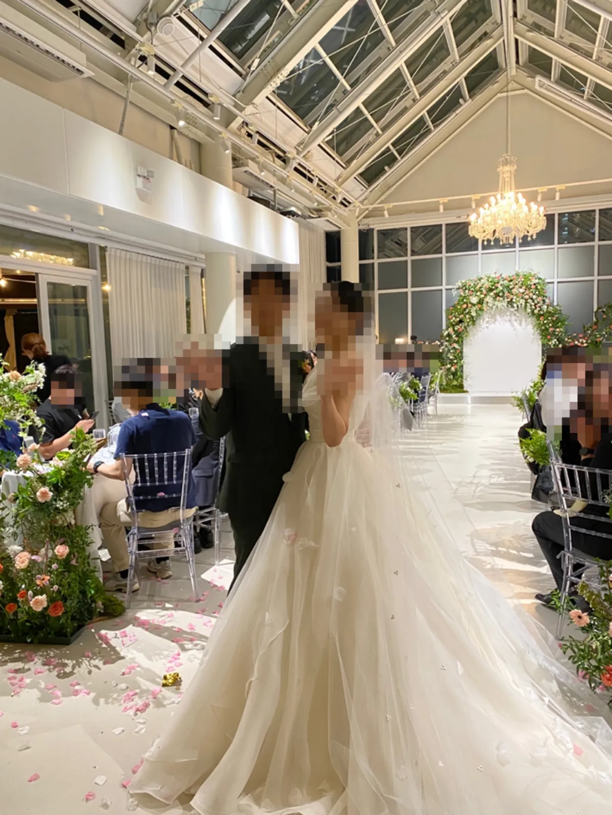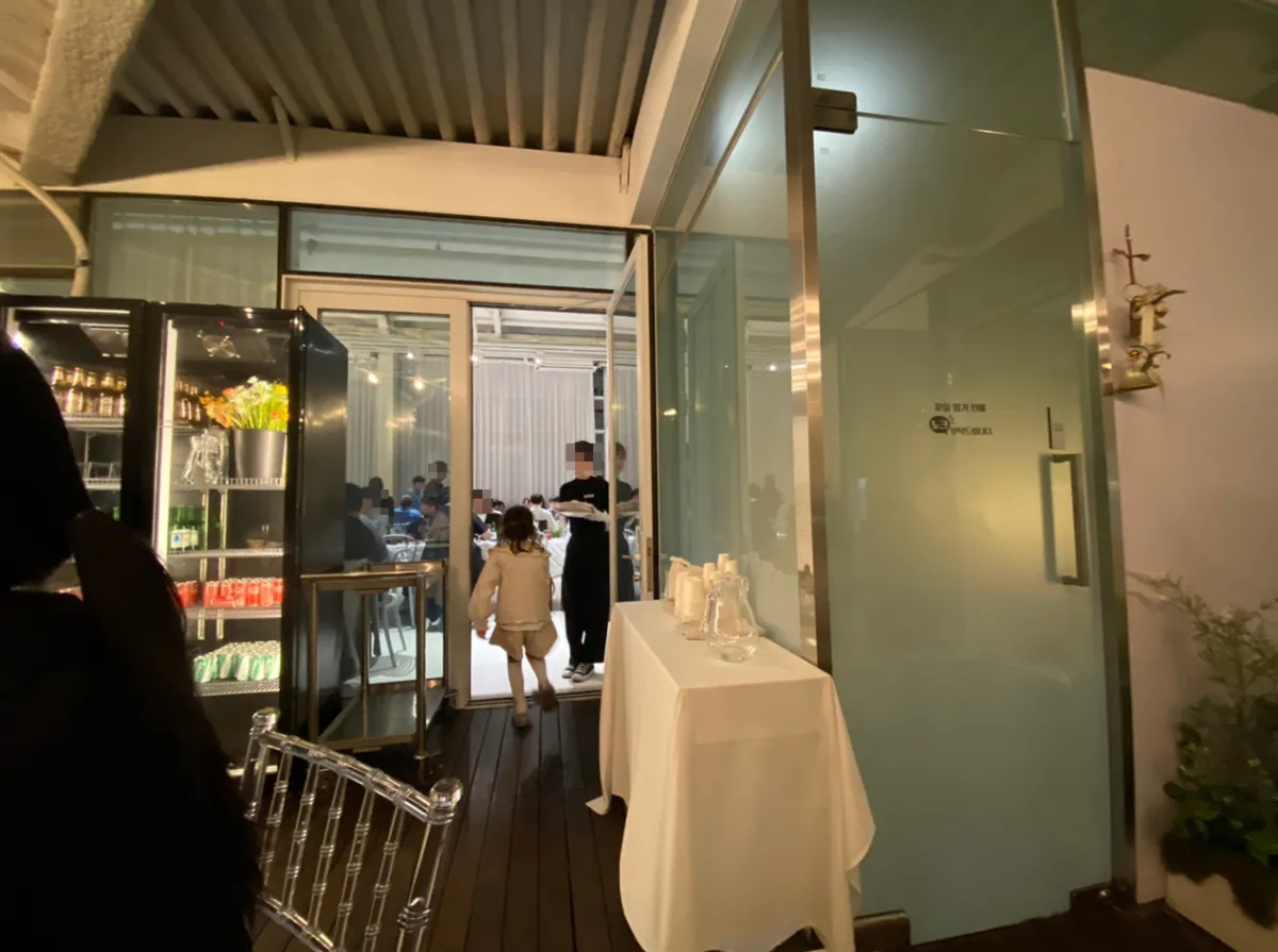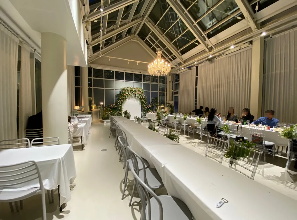 이날은 금요일 저녁 예식이었고 스몰 웨딩이다 보니 자리가 많지는 않았답니다. 신랑신부 입장하는 가운데 길 양쪽으로 길게 테이블이랑 의자가 배치되어 있었고 맨 왼쪽으로 4인용 테이블이 4개 정도 배치되어 있었어요. 이 자리에서 식후 음식도 먹습니다. 아무래도 스몰웨딩이다 보니 그에 맞춰서 하객도 초청을 했기 때문에 자리가 부족하거나 그러진 않았어요. 하객들은 대부분 직장 동료들과 지인들인 거 같았습니다.