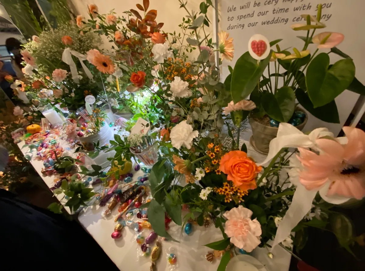 코너 쪽에 이렇게 예쁘게 꽃장식도 해두고 사탕 캔디로 아기자기하게 꾸며놓았어요. 이곳에서 신부가 2부 드레스도 입고 신랑과 사진도 찍는데 너무 예뻤어요!