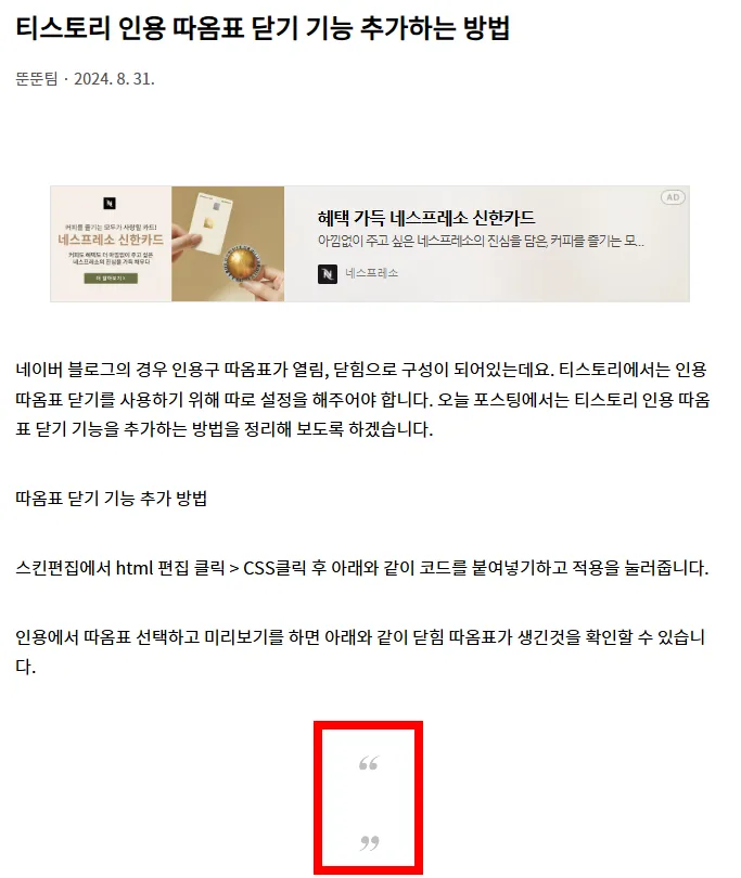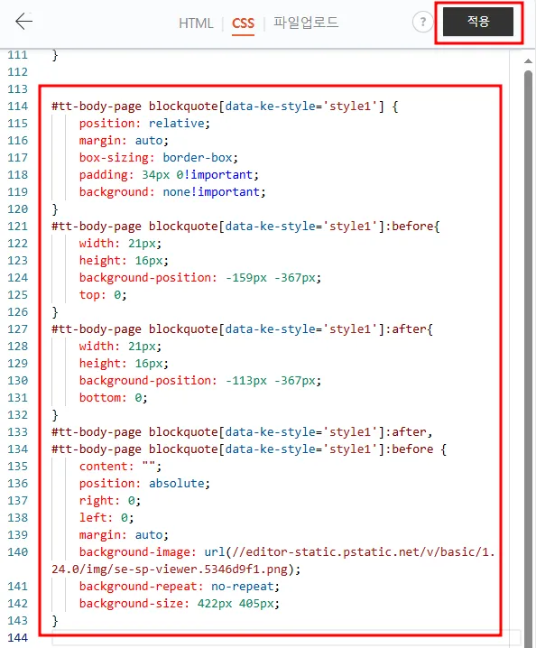 티스토리에서는 인용 따옴표 닫기를 사용하기 위해 CSS에 코드를 삽입해주어야 합니다.