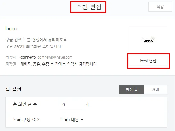 CSS 클릭 후 아래와 같이 코드를 붙여 넣기하고 적용을 눌러줍니다. 코드는 아래 파일로 다운로드할 수 있으니 활용하시기 바랍니다.