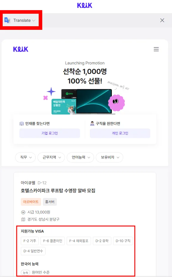 두 번째로 잡코리아입니다. 사람인과 마찬가지로 이력서를 작성하여 업로드해 두면 됩니다. 제가 아는 분의 경우 잡코리아를 통해 엔터테인먼트 회사에 취업을 한경우도 있습니다. 그리고 우측 상단에 'Klik'을 누르시면 외국인 인재를 채용하는 정보들을 한눈에 확인하실 수 있습니다.