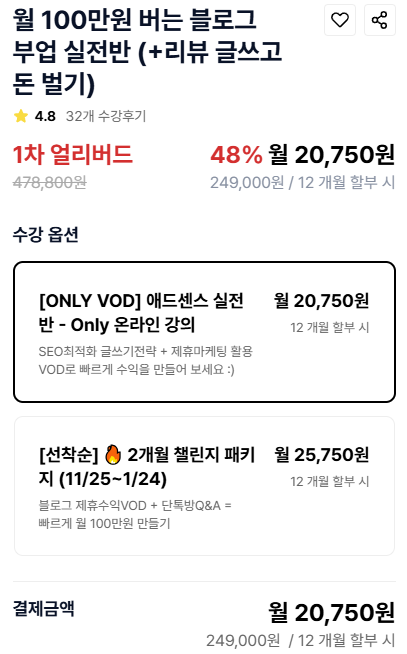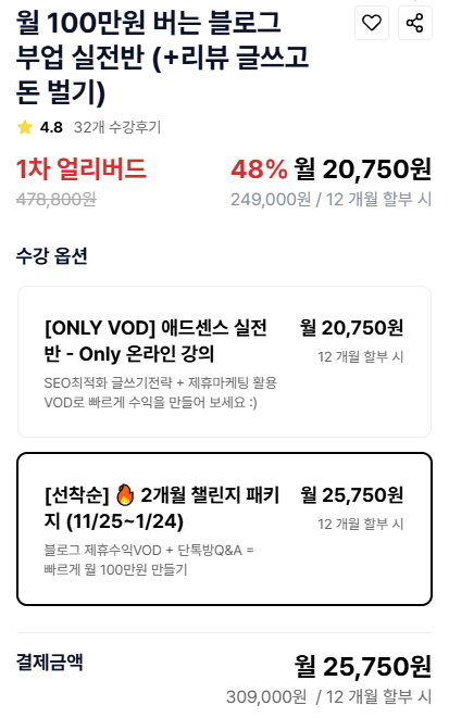 아레나님의 블로그 부업 실전반은 온라인 강의만 듣는 경우 249,000원, 단톡방 Q&A가 포함된 패키지는 309,000원입니다. 6만 원 차이이네요. 12개월까지 할부 결제도 가능합니다.
