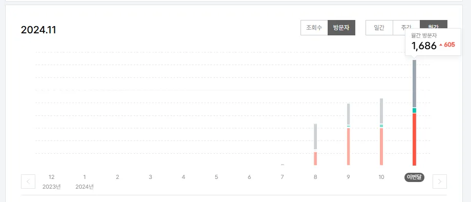 제 블로그는 올해 8월부터 시작했고요. 방문자도 점점 상승하는 추세를 보이고 있네요. 이번달은 약 1,700명이 방문했어요.