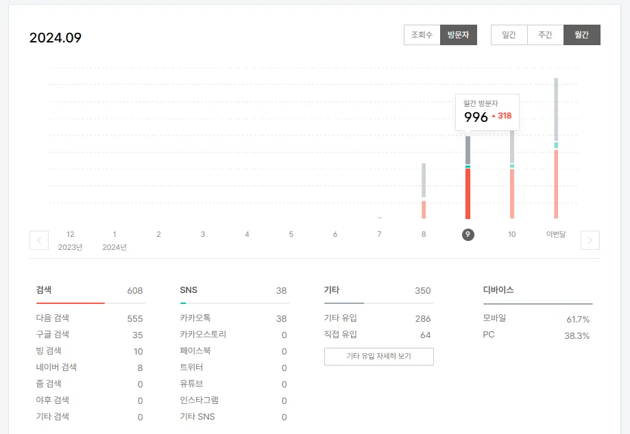 제 블로그는 올해 8월부터 시작했고요. 방문자도 점점 상승하는 추세를 보이고 있네요. 이번달은 약  1,700명이 방문했어요.