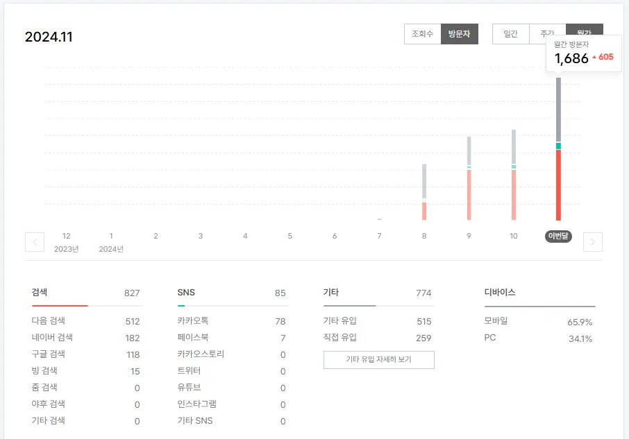 제 블로그는 올해 8월부터 시작했고요. 방문자도 점점 상승하는 추세를 보이고 있네요. 이번달은 약 1,700명이 방문했어요.